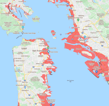 Image depicting the areas in the San-Fransisco Bay Area that will be completely submerged by 2050.