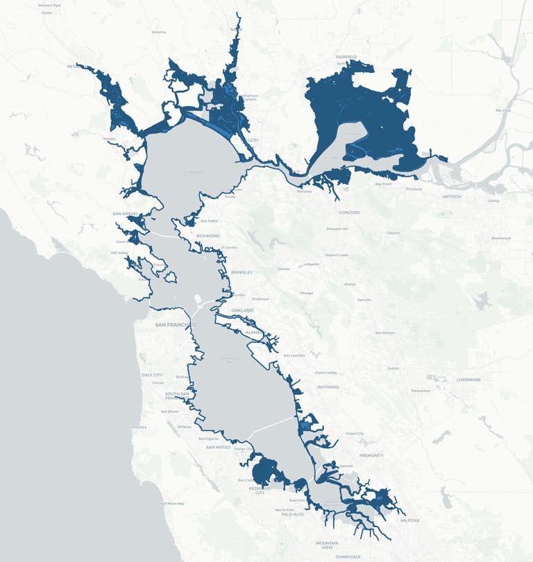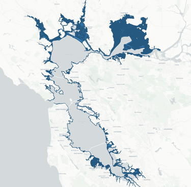Image depicting the areas in the San-Fransisco Bay Area that will be completely submerged by 2050.